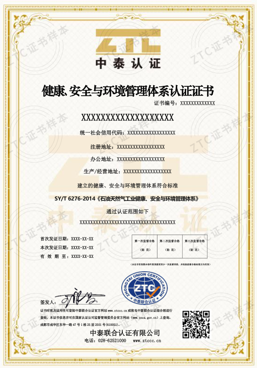 認證標準3:SY/T 6276-2014《石油天然氣工業健康、安全與環境管理體系》