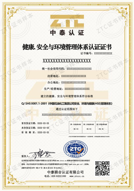 認證標準2:CTS Q/SHS 0001.1-2001《中國石油化工集團公司安全、環境與健康(HSE)管理體系》