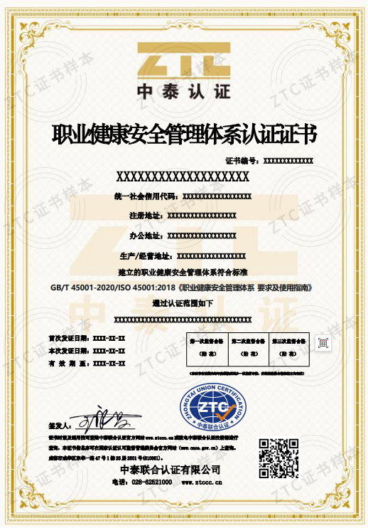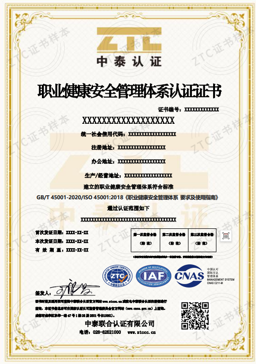 認證標準:GB/T 45001-2020/ISO 45001:2018《職業健康安全管理體系要求及使用指南》