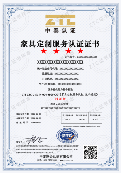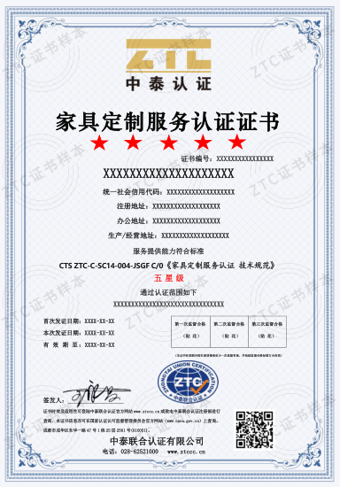 認(rèn)證標(biāo)準(zhǔn):CTS ZTC-C-SC14-004-JSGF C/0《家具定制服務(wù)認(rèn)證 技術(shù)規(guī)范》