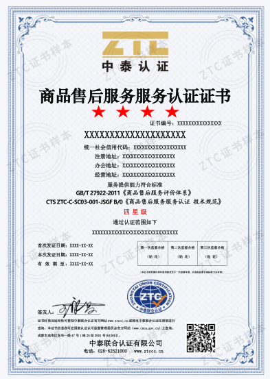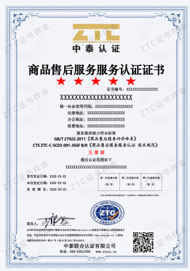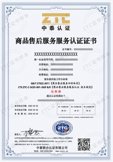 認(rèn)證標(biāo)準(zhǔn):GB/T 27922-2011《商品售后服務(wù)評(píng)價(jià)體系》和CTS ZTC-C-SC03-001-JSGF B/0《商品售后服務(wù)服務(wù)認(rèn)證 技術(shù)規(guī)范》