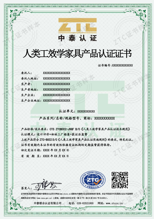 認證標準:CTS ZTCB002-JSGF B/0《人類工效學家具產品認證技術規范》