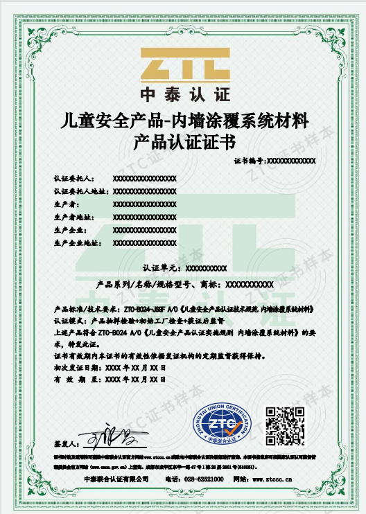 實施規(guī)則:ZTC-B024 A/0 《兒童安全產(chǎn)品認證實施規(guī)則 內(nèi)墻涂覆系統(tǒng)材料》