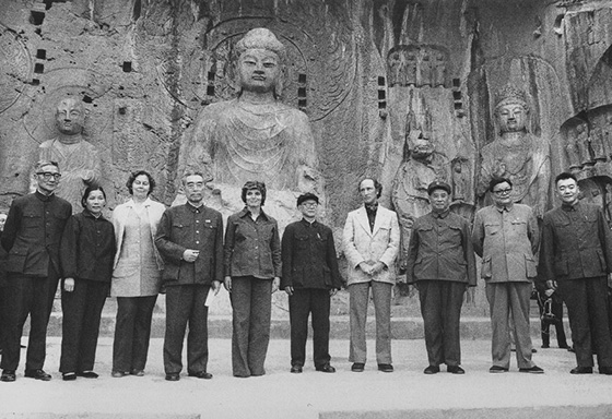 1973年10月,周恩來與特魯多(右四)一行在河南洛陽龍門石窟合影