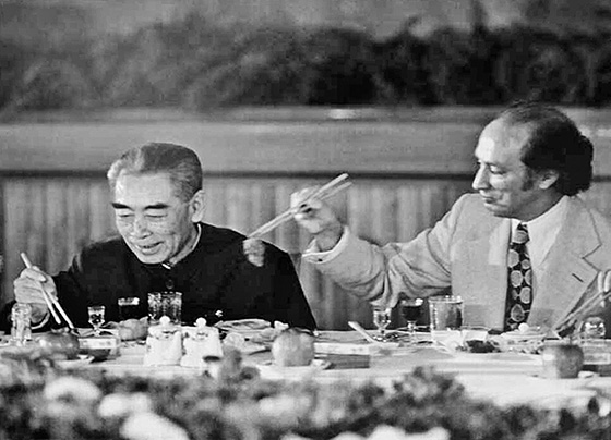 1973年10月12日,在人民大會堂舉行的宴會中,特魯多學著使用筷子,并給周恩來夾菜