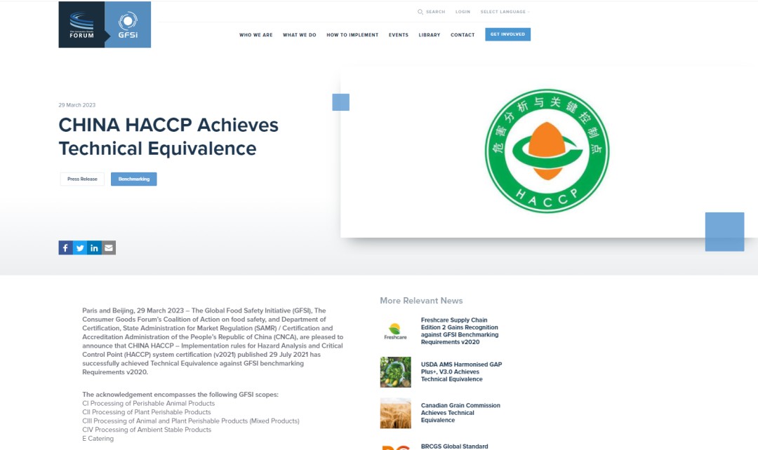 中國危害分析與關(guān)鍵控制點(diǎn)體系認(rèn)證(CHINA-HACCP)再次與全球食品安全倡議組織(GFSI)達(dá)成技術(shù)互認(rèn)